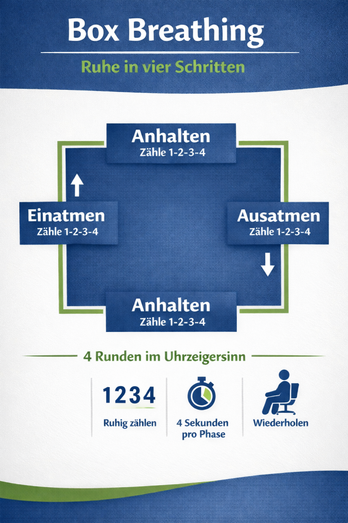 Eine gute Quelle sind Menschen, die regelmäßig in Chaos und Unsicherheit funktionieren müssen. Militär, Polizei, Rettungsdienst, Feuerwehr. Die nutzen eine Atemtechnik, die so simpel ist, dass dein Kopf sie sogar unter Stress noch schafft. Sie heißt Tactical Breathing. Viele nennen sie Box Breathing.